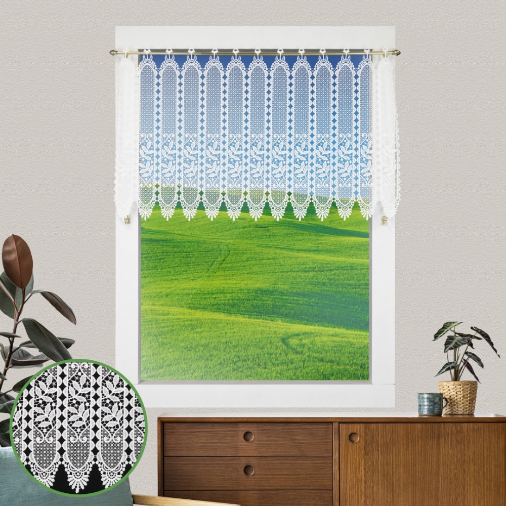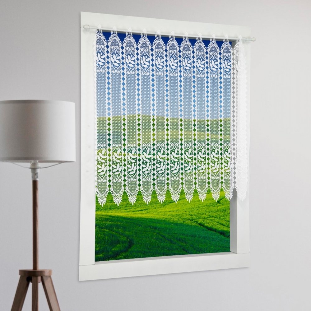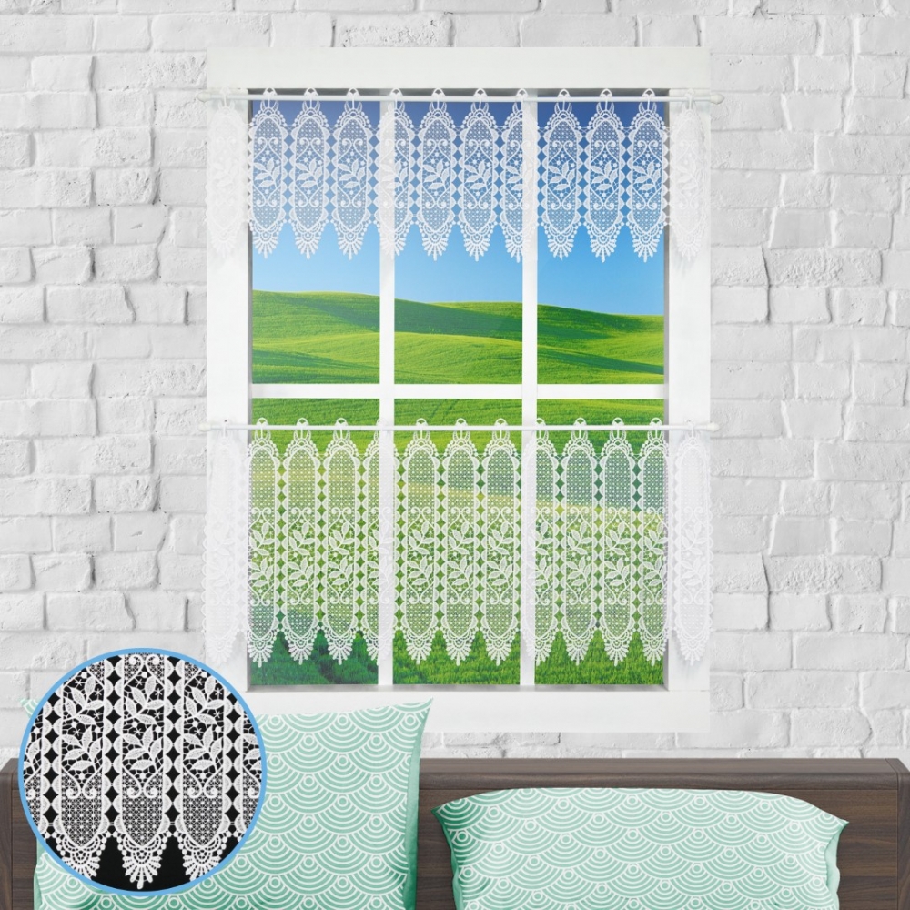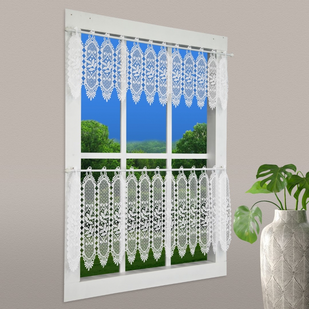 Diese Bistrogardine besteht komplett aus Makramee-Spitze, mit gestickten Ösen für den Durchschub von Scheibengardinenstangen gegeignet