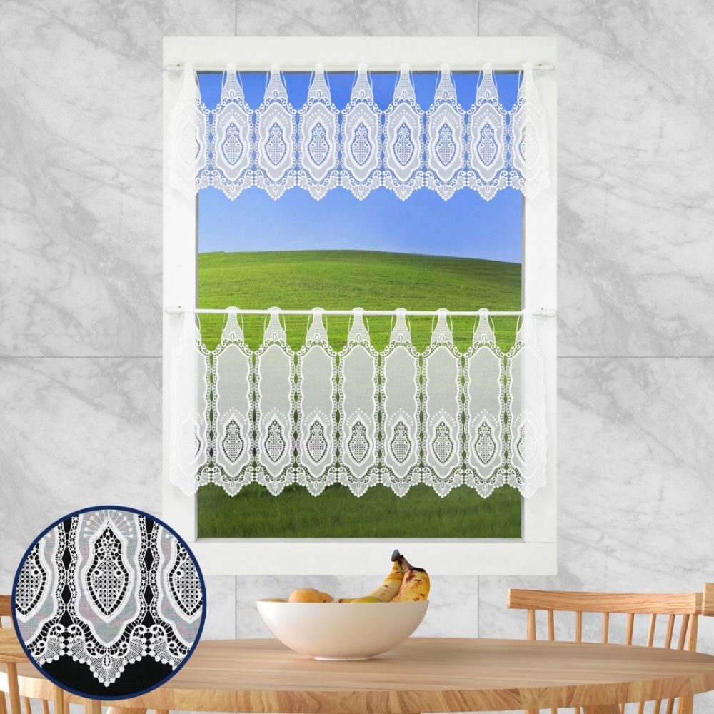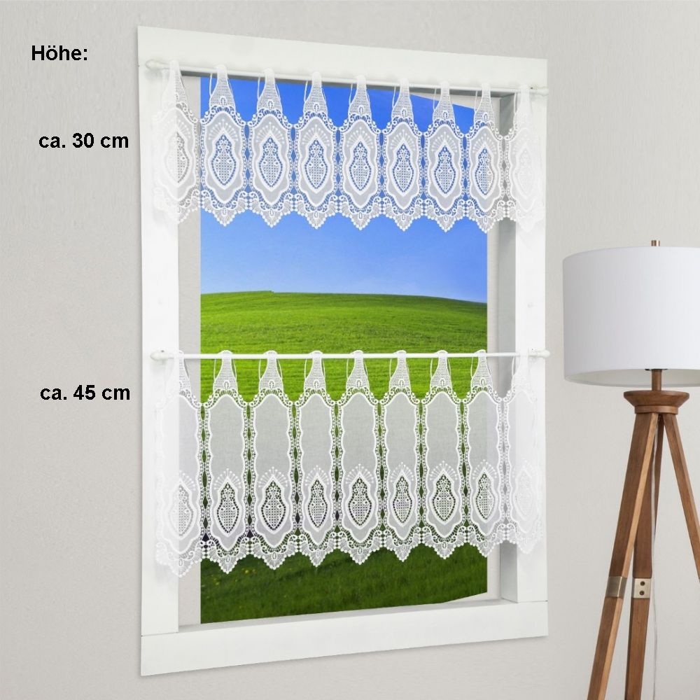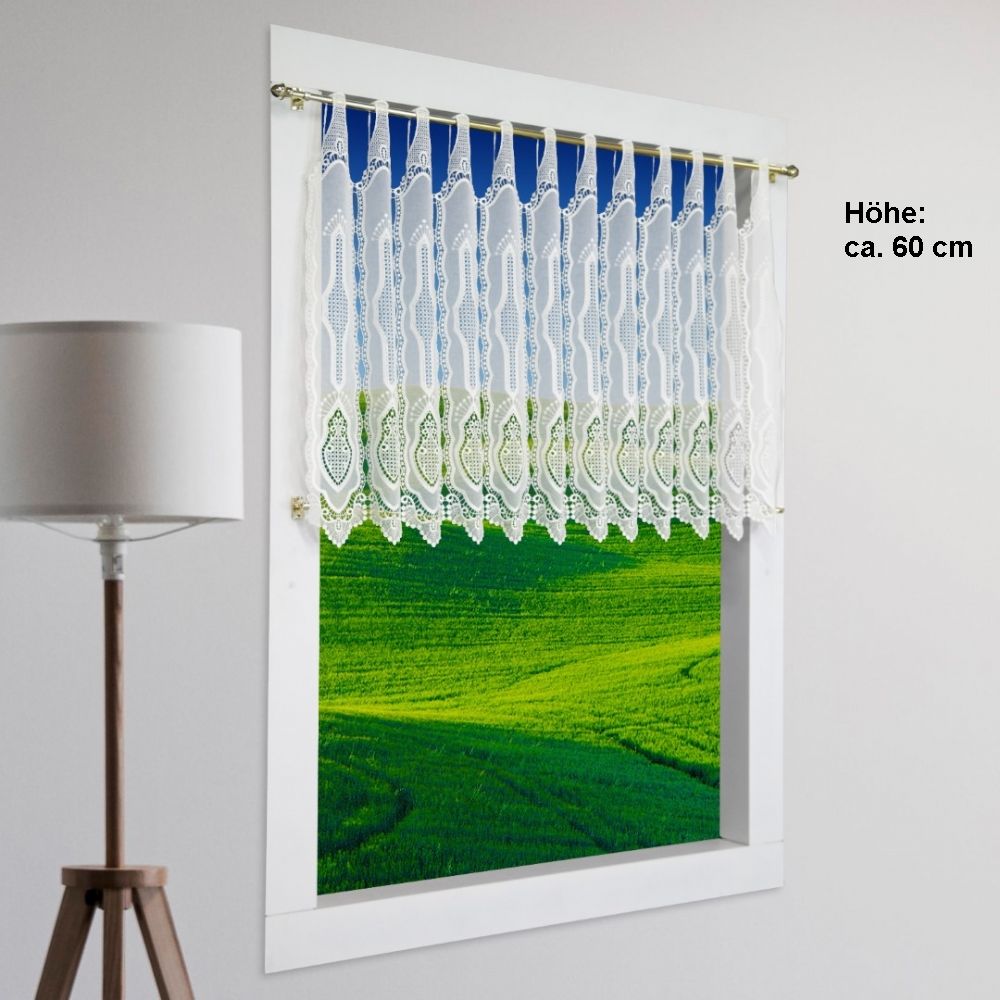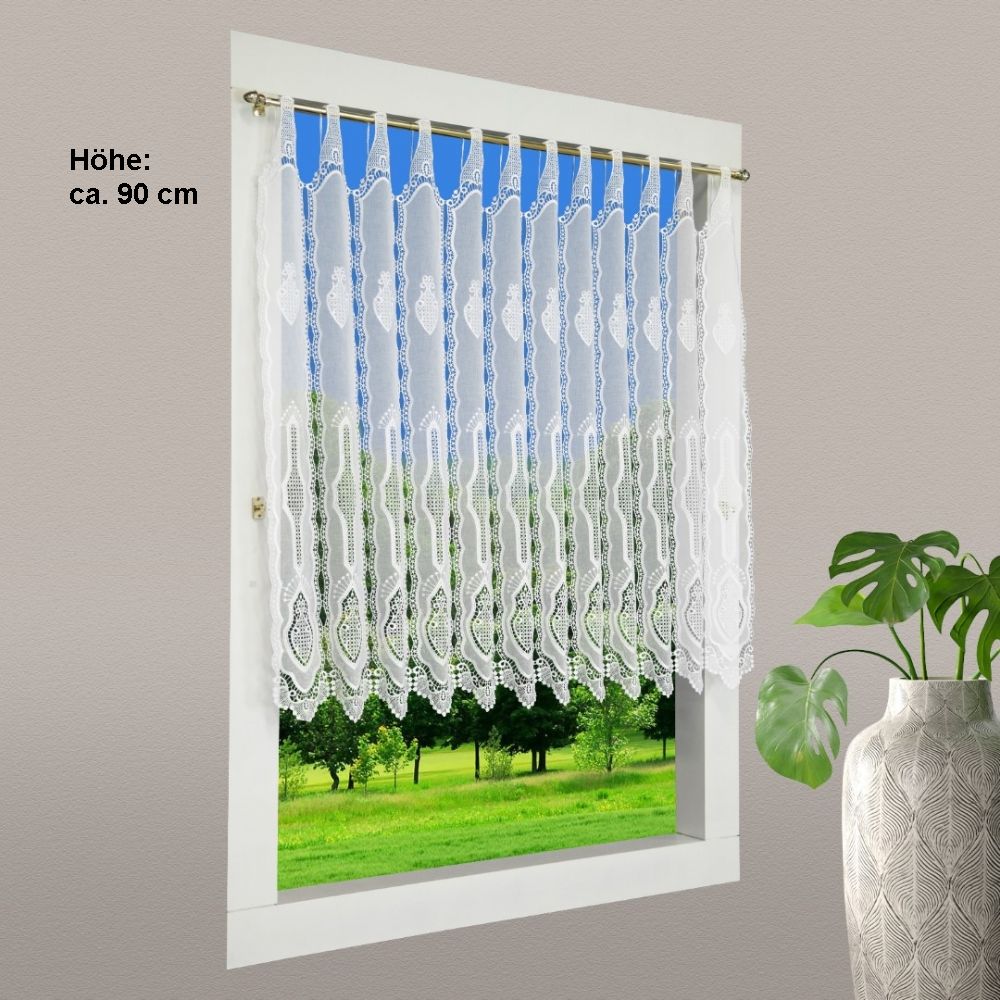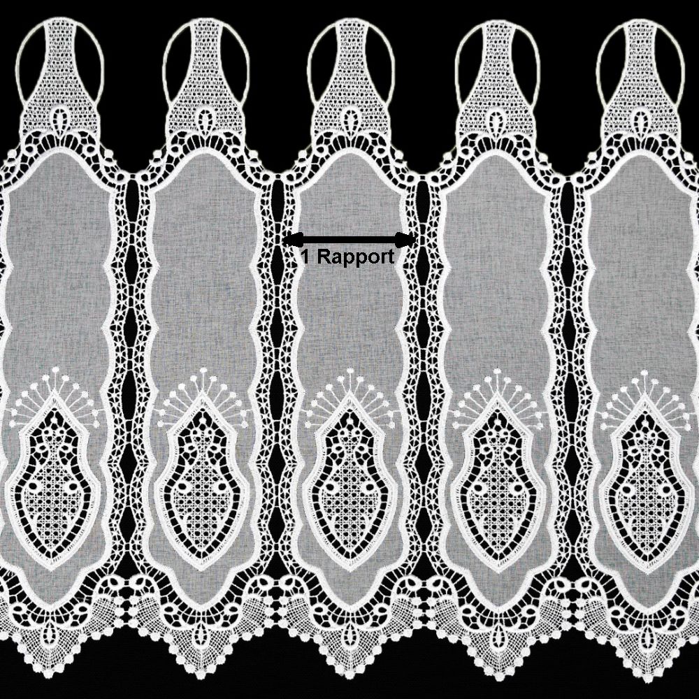 Bei unserem Artikel Meißen handelt es sich um ein Panneaux mit Applikation auf Etamin, mit gestickten Schlaufen, für den Durchschub von Scheibengardinenstangen geeignet.
