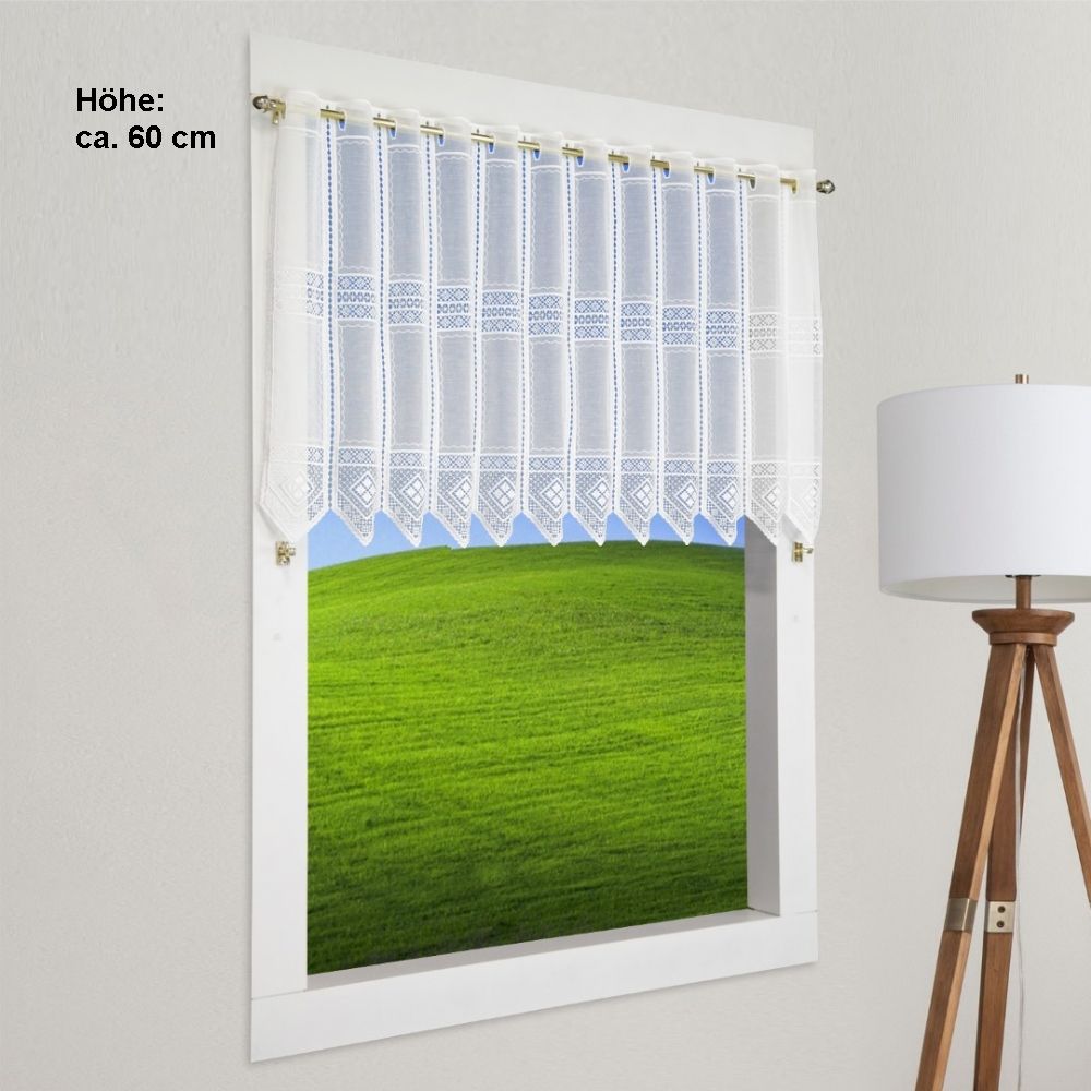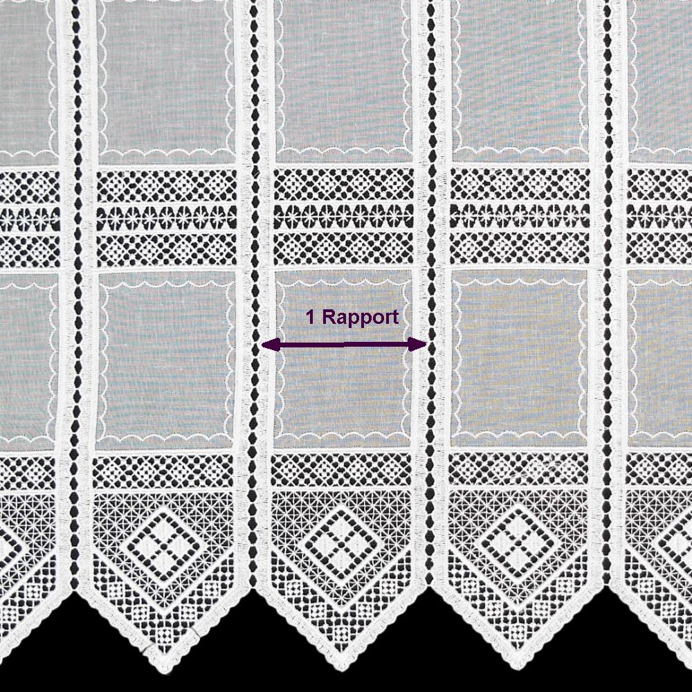 Bitte wählen Sie Ihre Wunschfarbe aus - weiß oder creme. Durch die unterschiedlichen Höhen, können Sie Ihr Fenster individuell dekorieren (30 / 45 / 60 oder 90 cm) Ein Rapport (Muster) ist ca. 10,8 cm breit, bitte berechnen Sie hier Ihre passende Breite. Bitte bestellen Sie entsprechend der Anzahl Ihrer benötigten Rapporte. (Beispiel: Fensterbreite: 110 cm = 10 Rapporte a 10,8 cm) Bitte beachten Sie, dass auf dem Foto unterschiedliche Höhen kombiniert wurden. Für eine ähnliche Dekoration bestellen Sie bitte die verschiedenen Höhen einzeln. Wir empfehlen diesen Artikel glatt oder nur leicht gerafft zu verwenden. Sollte eine andere, individuelle Raffung gewünscht sein, muss der Stoffbedarf entsprechend angepasst werden.