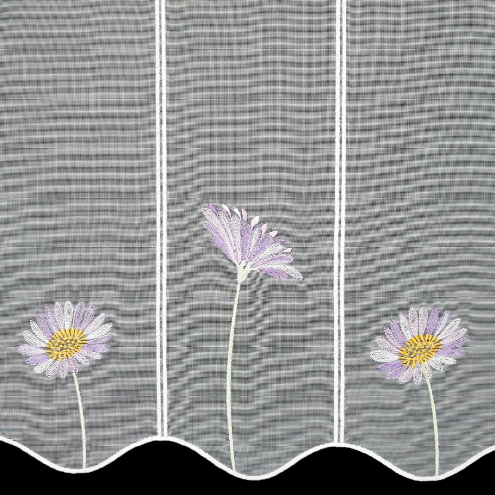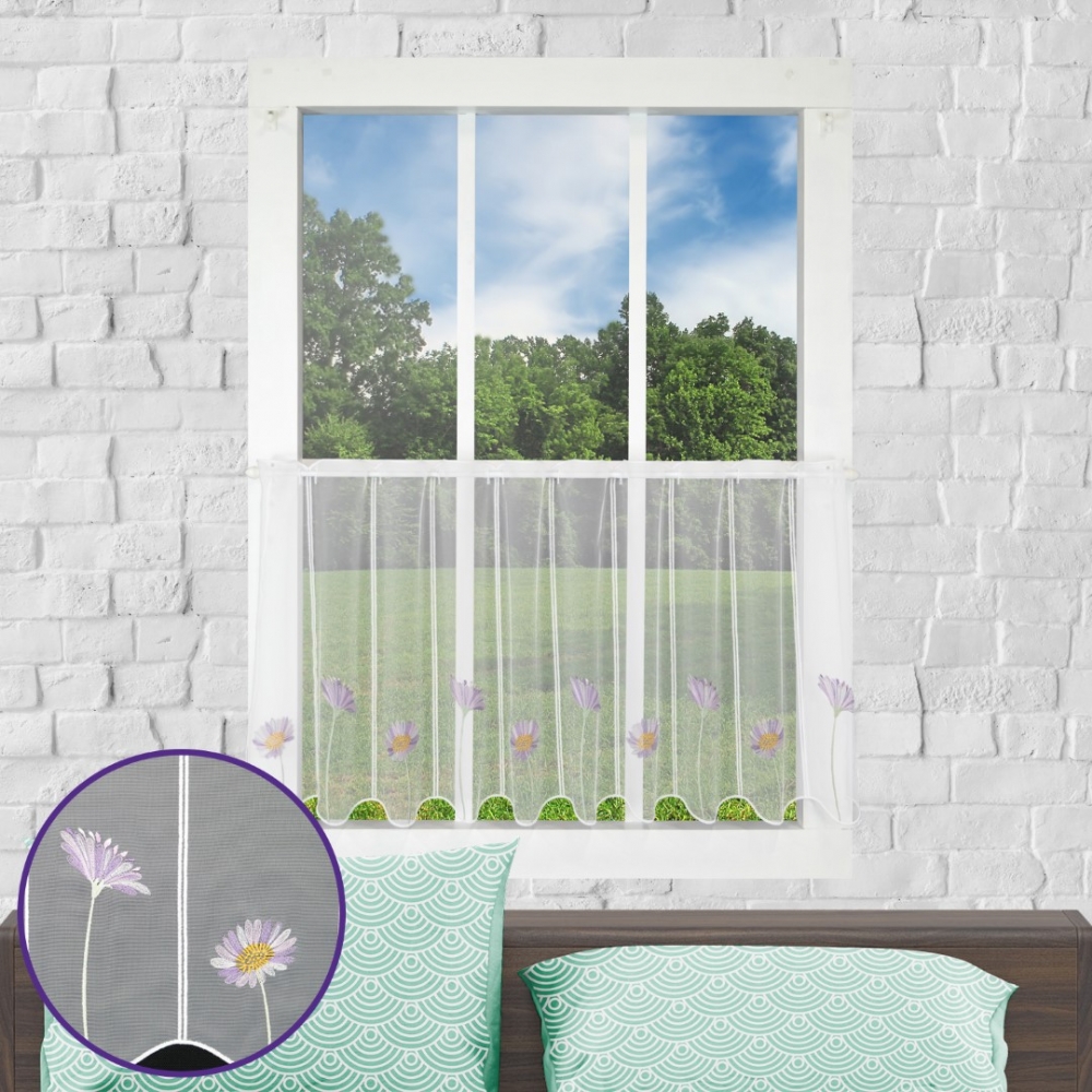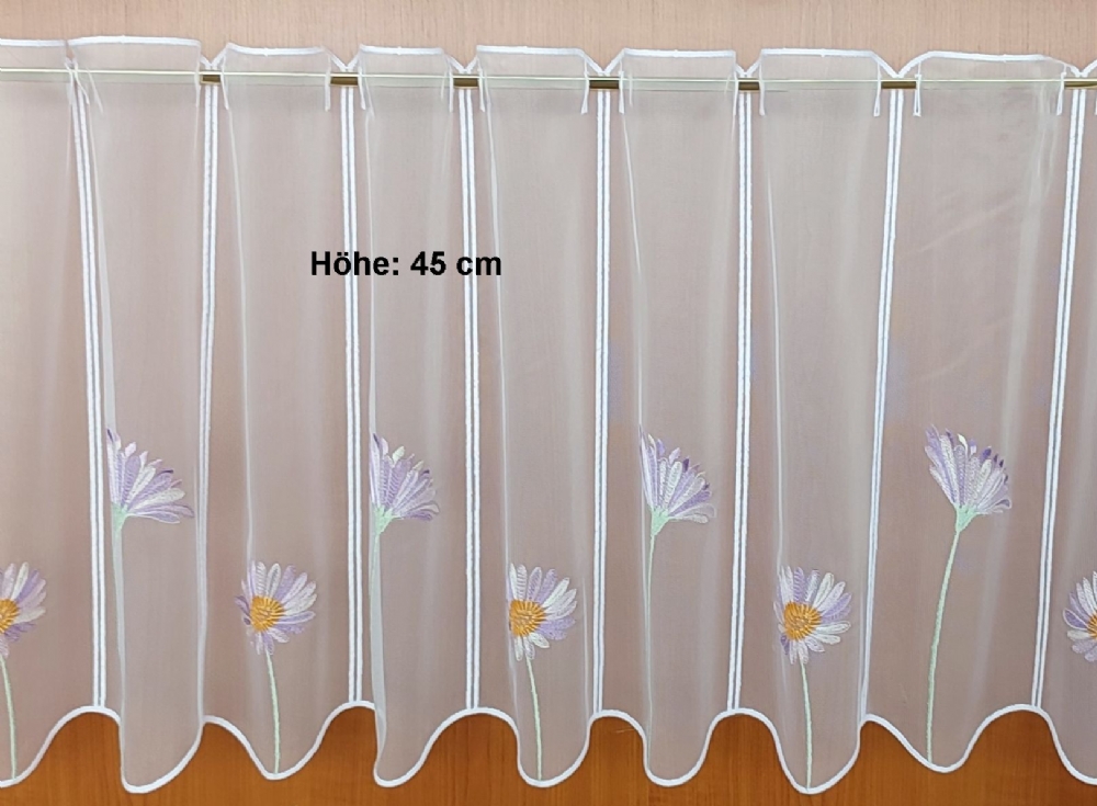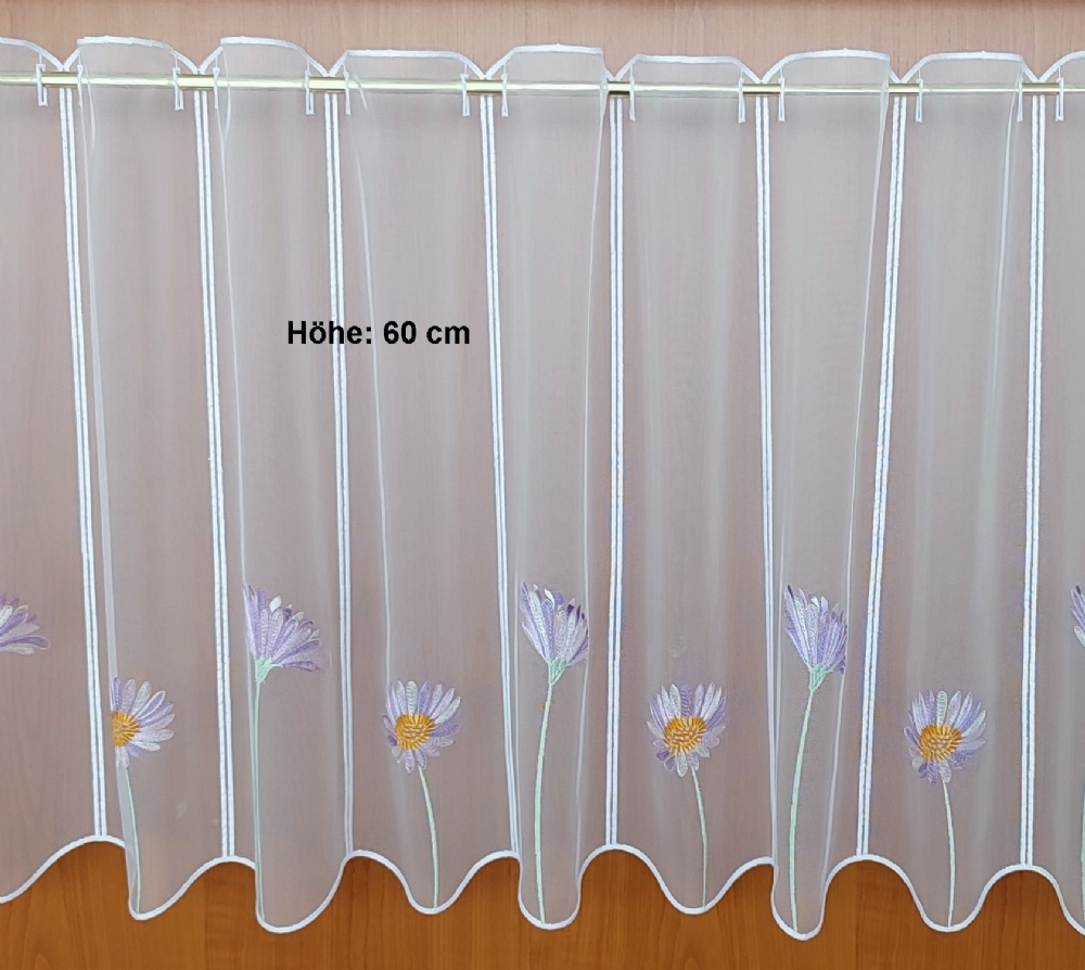 Bei unserer Scheibengardine Sebnitz handelt es sich um eine farbig bestickte Grundware aus Dreher Sablé, mit gestickten Ösen für den Durchschub von Scheibengardinenstangen gegeignet