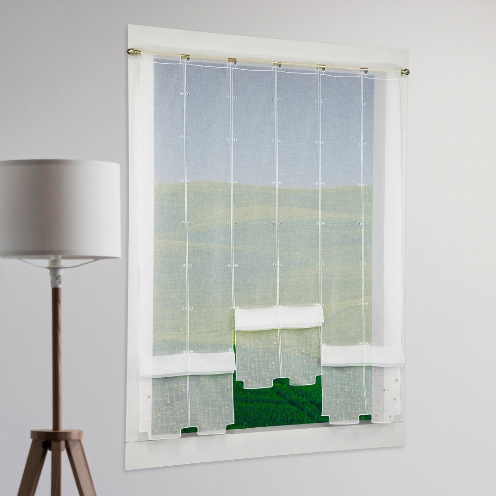 Durch die, jeweils zwischen den einzelnen Rapporten eingearbeiteten kleinen Raffösen, kann unsere Gardine Ihren individuellen Höhen-Bedürfnissen angepasst werden. In diesem Fall werden die einzelnen Rapporte durch Einhängen von Clips in dekorative Falten gelegt.
