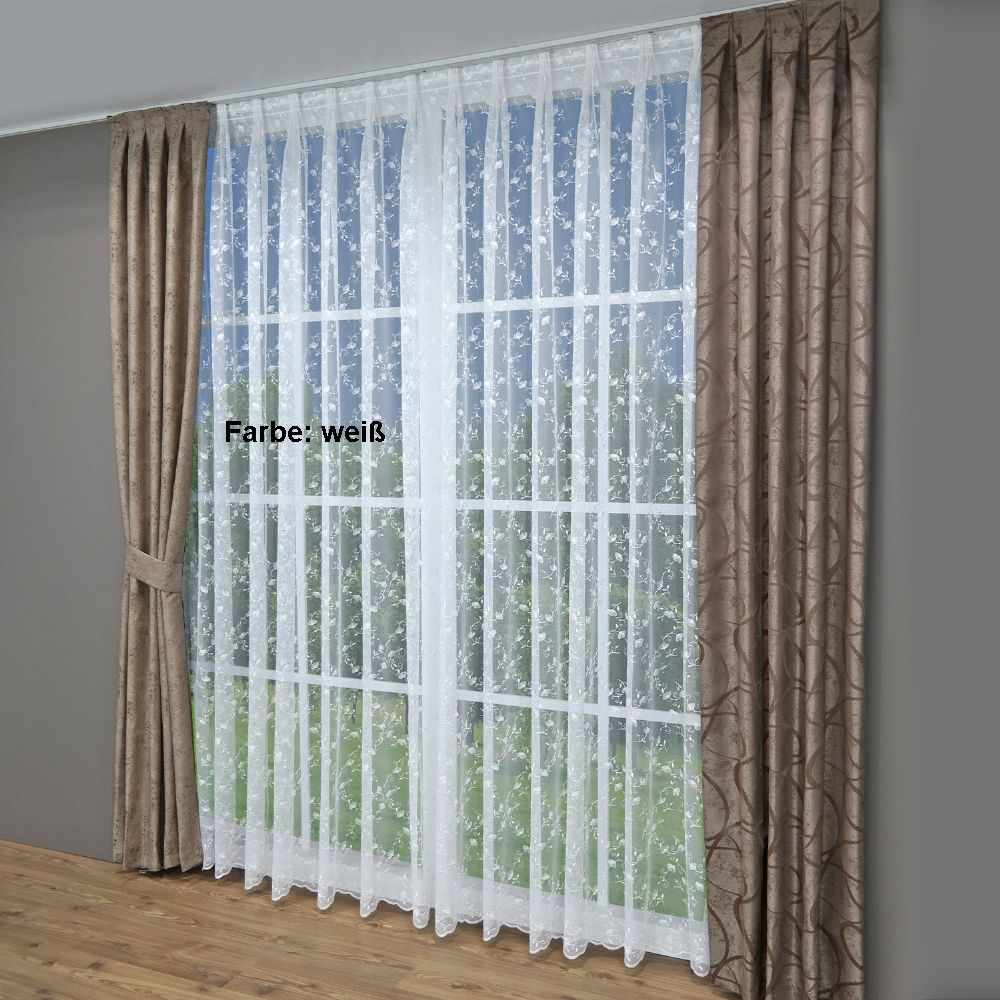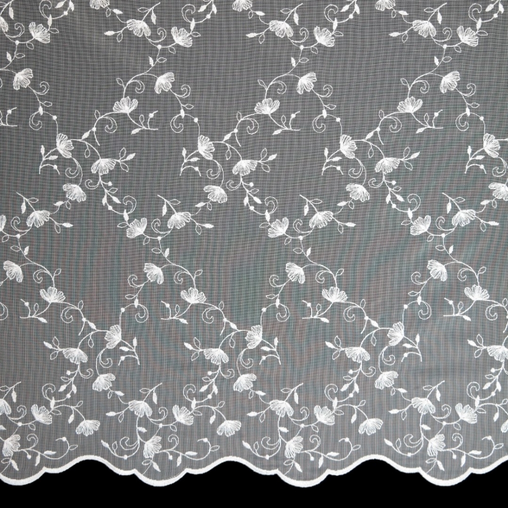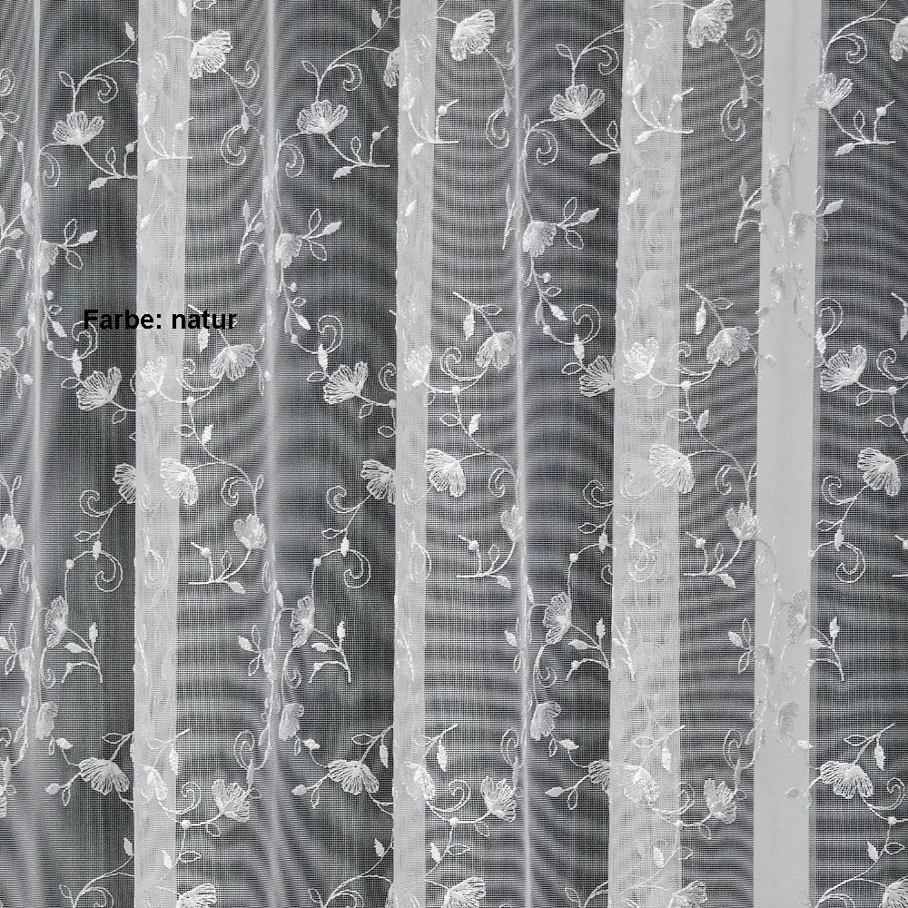 Die Storeware Waldheim ist eine weiße oder naturfarbene Grundware aus Markisette / Florentiner auf Gittertüll mit Blumenranken bestickt und gebogtem Abschluss.