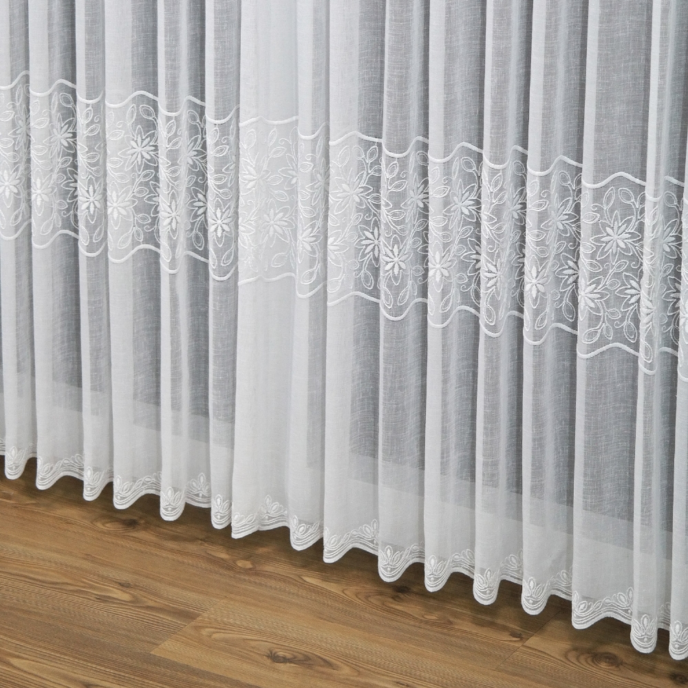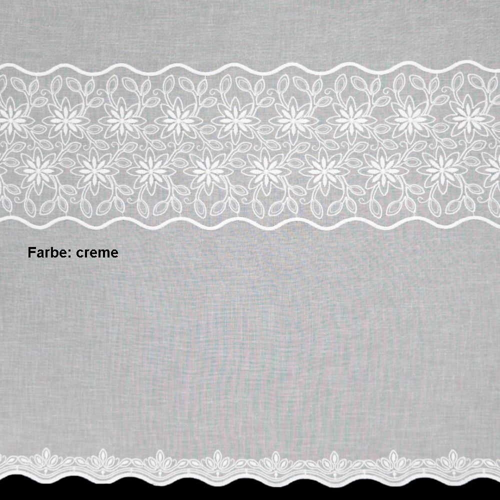 Die Meterware Seiffen ist eine weiße oder cremefarbene, bestickte Grundware aus Feinkäseleinen mit modernen gebogten Abschlüssen.