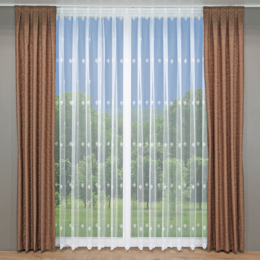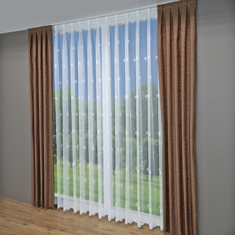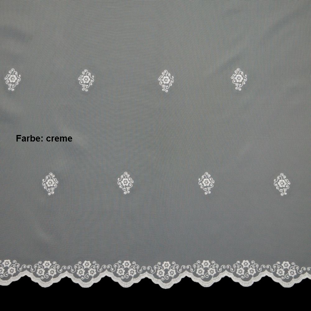 Die Grundware wurde mit matter Ton-in-Ton-Stickerei in weiß oder creme veredelt. Den Abschluss bildet eine dekorative, gebogte Kante.