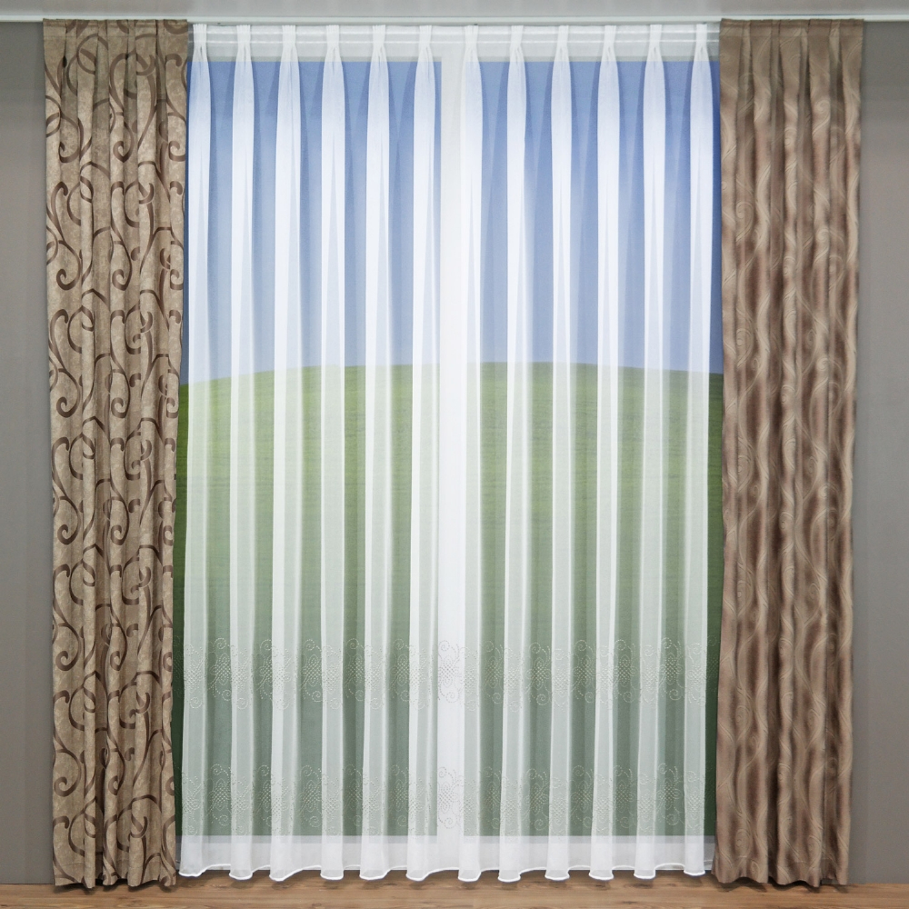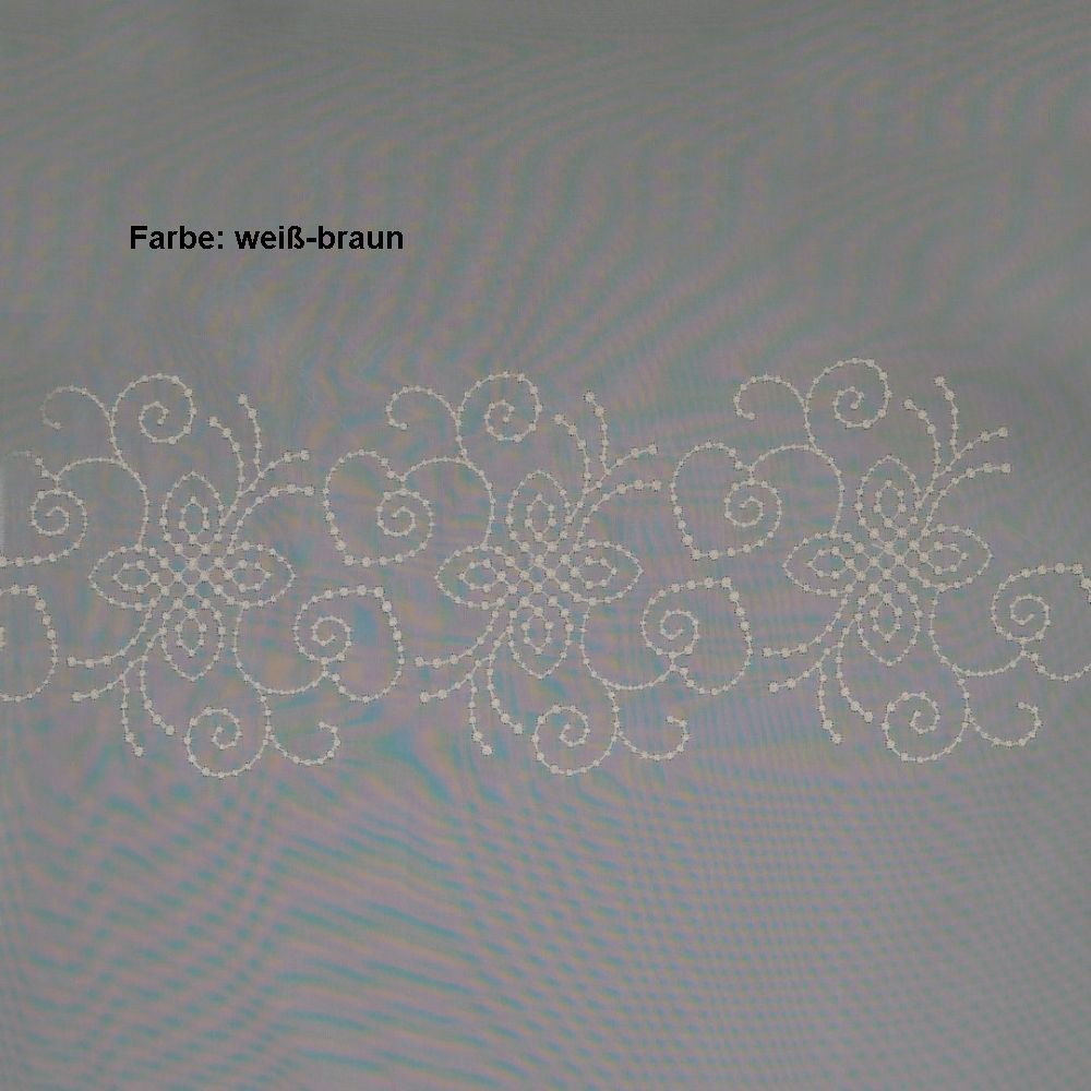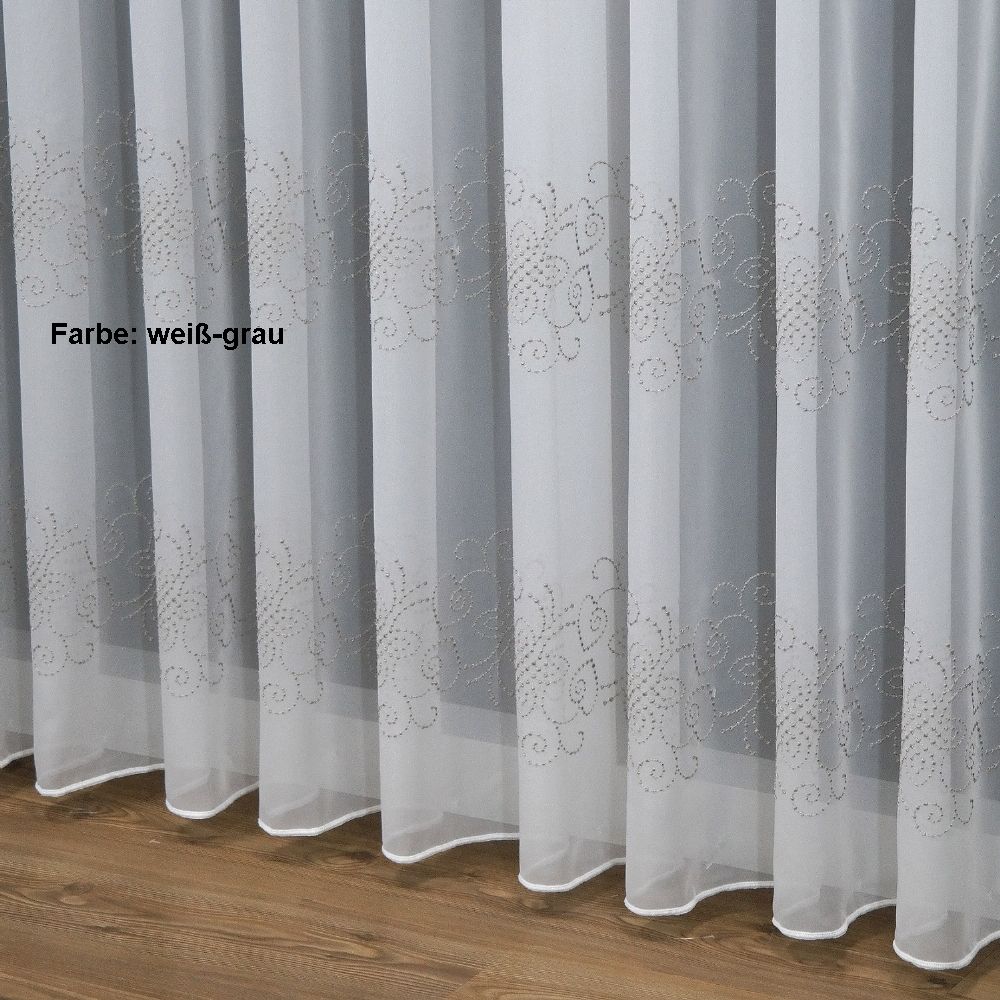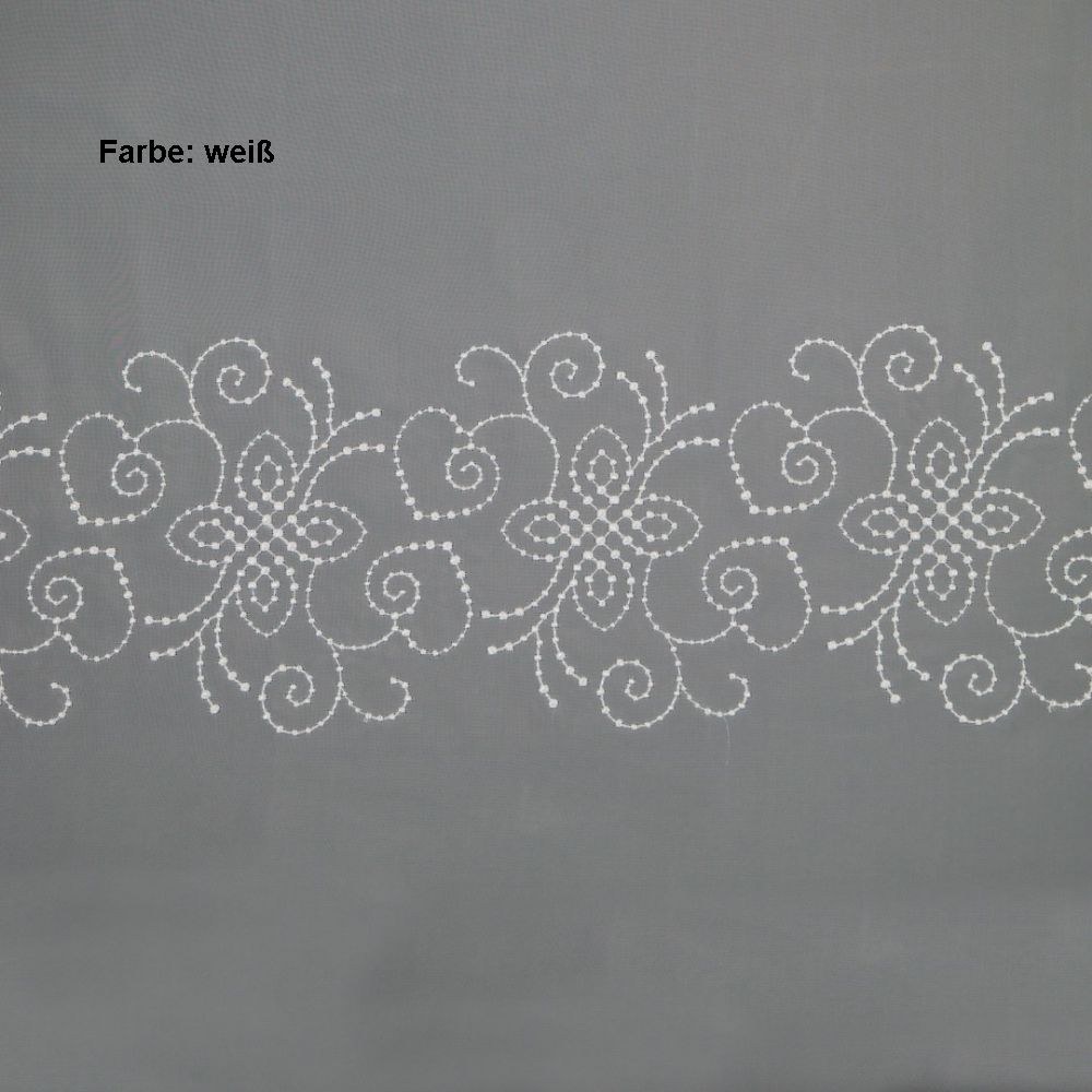 Unsere Storeware Oberlausitz ist eine weiße, im floralen Design bestickte Grundware aus zartem Voile.