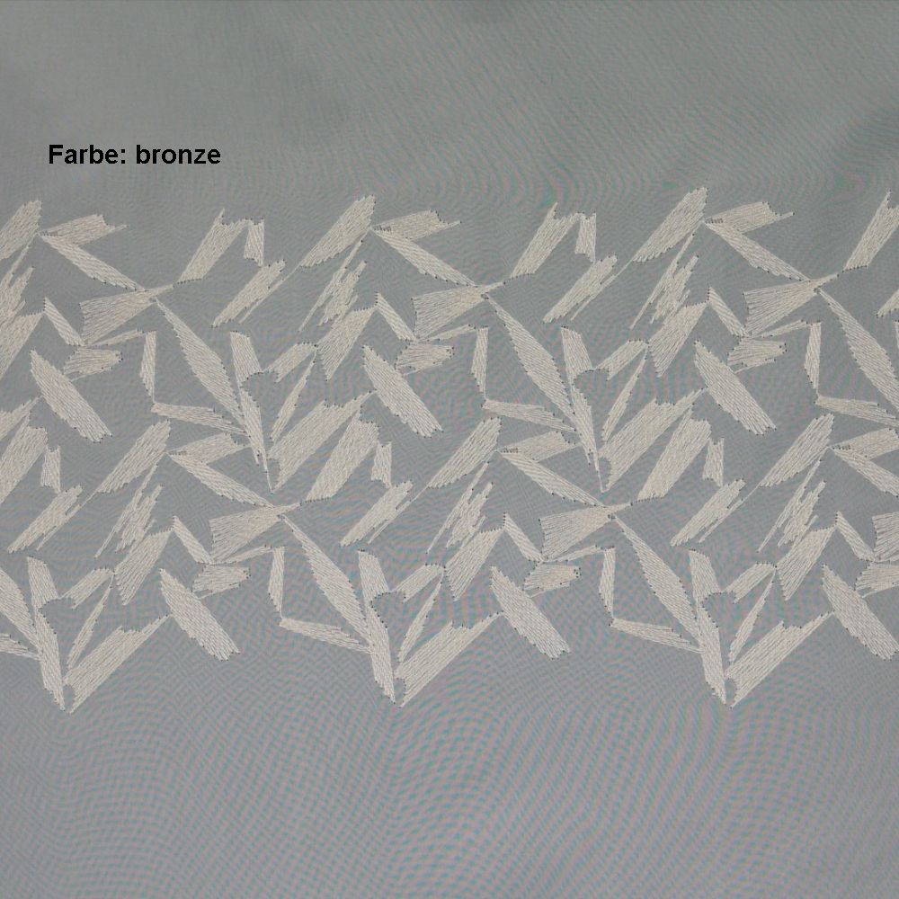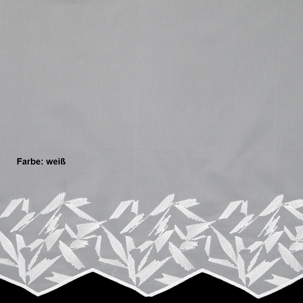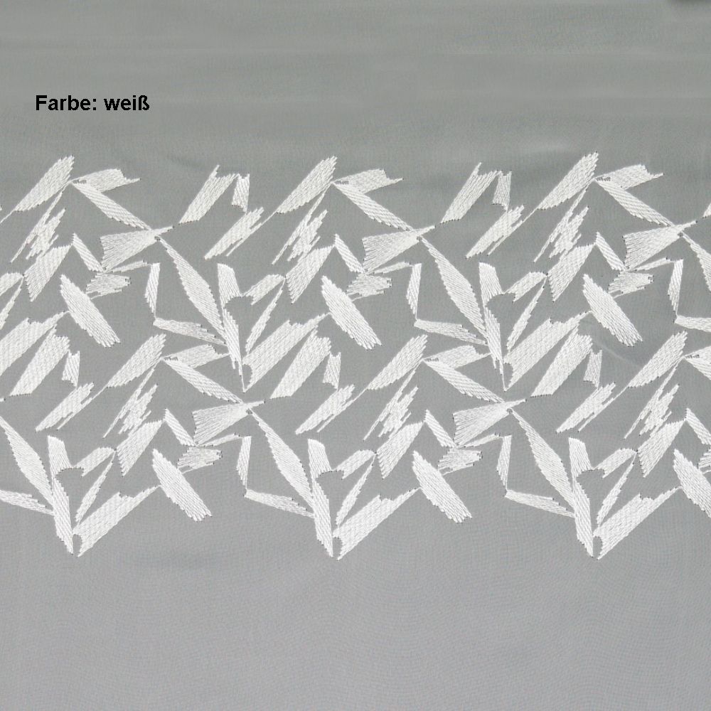 Die Meterware Crottendorf ist eine weiße, im grafischen Design bestickte Grundware aus luftigem Voile.